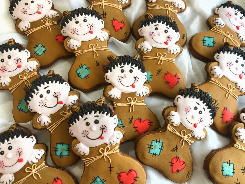 Zdobení - čertíci jsou zdobení bílkovou polevou a potravinářskými fixy. Zdobeno ručně.