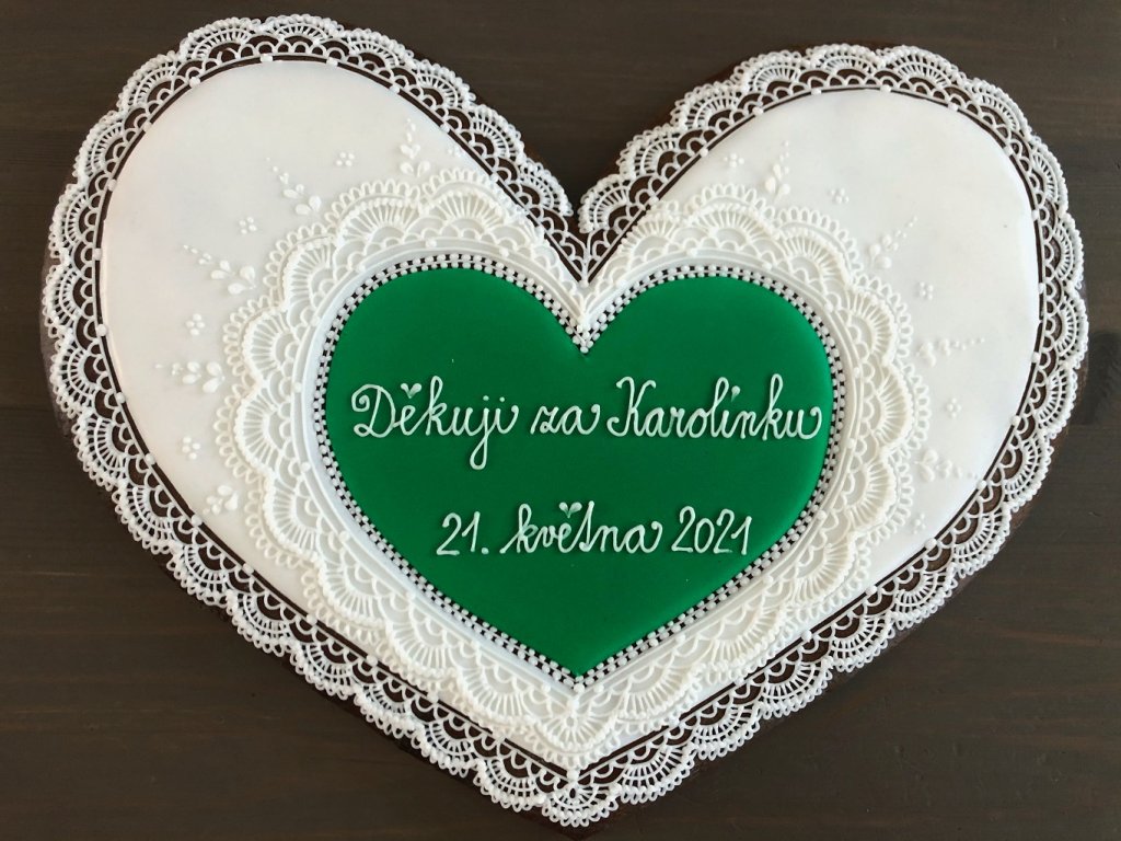 Zdobení - srdíčko je zdobeno bílkovou polevou, vnitřní srdce je obarveno potravinářskými barvami. Ruční práce.
